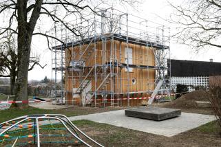Das ursprünglich geplante, unterirdische Einbauen der Heizzentrale beim Schulhaus stellte sich aufgrund der hohen Kosten als nicht umsetzbar heraus. Die Gemeinde beschloss, alternative Lösungen zu suchen und Neues zu wagen. Mit einer Container-Bauweise wurde die Heizzentrale oberirdisch neu erstellt. Die Anlieferung der Holzschnitzel ist so einfacher möglich, die Feuerungen sind räumlich platzsparend installiert. Optisch passt sich die Zentrale durch die Verkleidung mit einer Holzfassade gut ins Quartier ein.