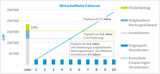 Das Teilprojekt wurde durch das Förderprogramm Optivent mit knapp 28‘000 Franken unterstützt. Dadurch reduzierte sich die Investition von 185‘000 Franken auf 157‘000 Franken. Die Paybackzeit verringerte sich bei einem Standardstrompreis von 15 Rappen pro kWh dank dem Förderbeitrag von 7.7 auf 6.5 Jahre.